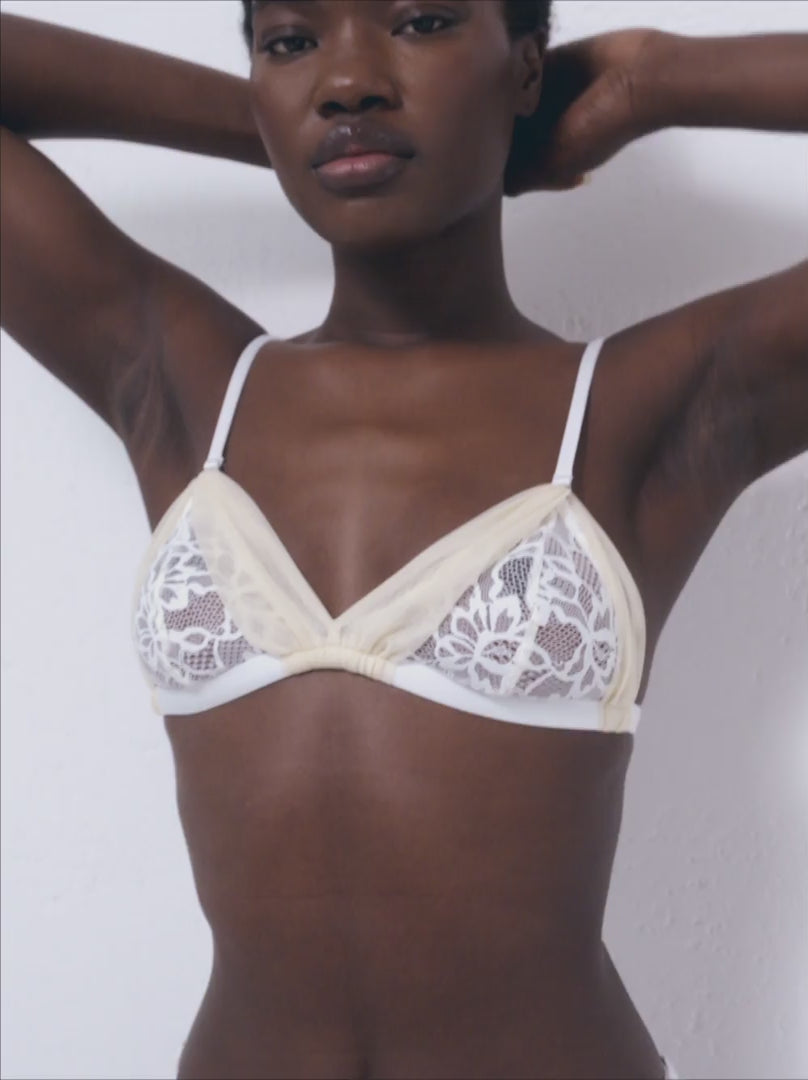 This bralette is crafted from soft, high-quality white eco-lace with a sheer finish. The sides feature a layer of beige/off-white recycled micro mesh for added contrast and details. The back contour and adjustable straps are covered in a slightly shiny, durable white jersey. A eco-lace detail matching the cups adorns the end of the back strap, the hook-and-eye closure offers three adjustable sizes for a perfect fit.