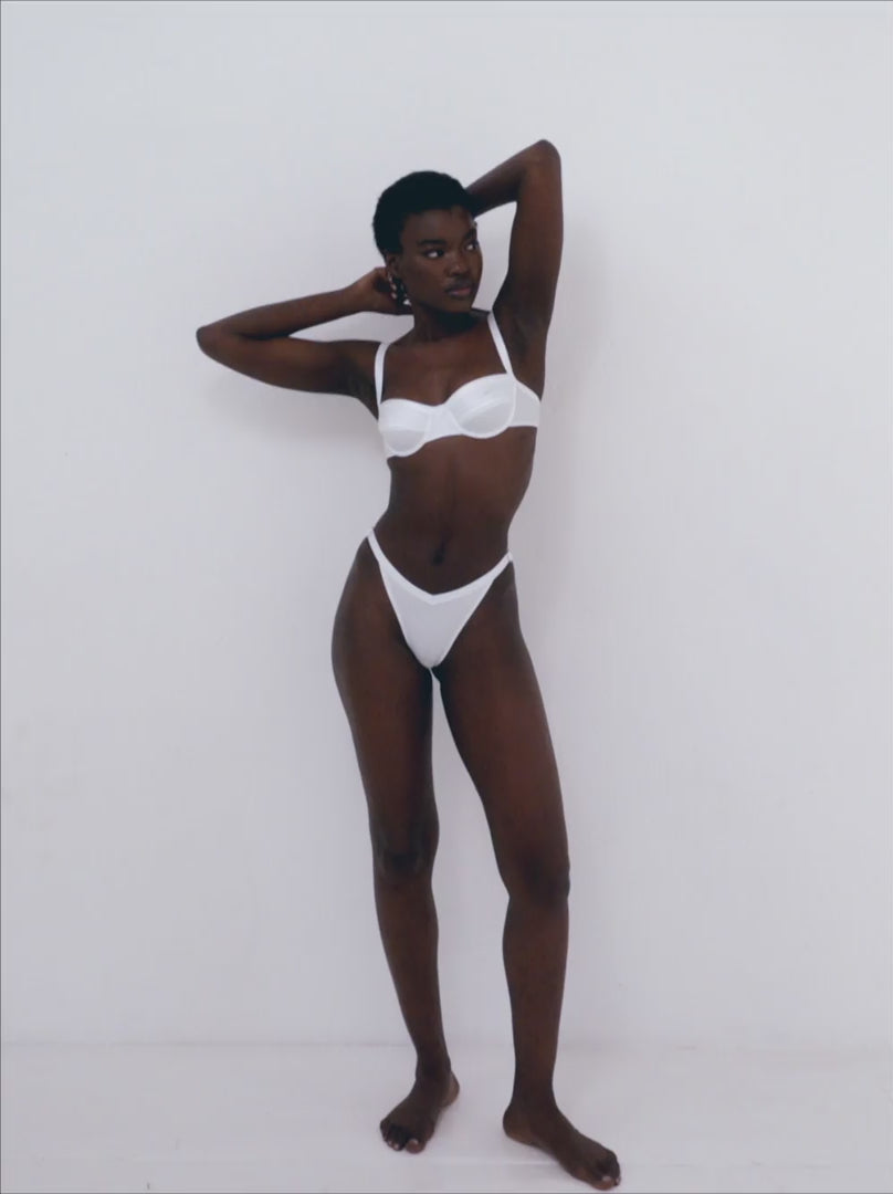 Dori is wearing Size XS in the Libertad Set. The Libertad Balconette style in White and Black fits smaller than other options.